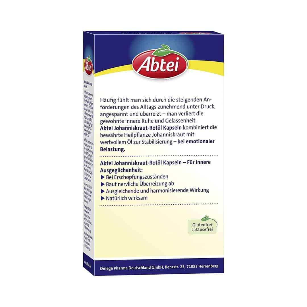 Traditional herbal medicinal product for use solely on the basis of many years of use for the following areas of application: Strengthens the nerves and relieves nervous overstimulation. The stress of everyday life can manifest itself in the form of tiredness, exhaustion and nervous instability. The natural St. John’s wort helps to counteract these circumstances and restore mental balance. Refined into valuable St. John’s wort red oil, it contributes to well-being. Emotional stress can be reduced and inner balance restored. Abbey St. John’s wort red oil capsules are herbal medicines that are manufactured using traditional monastic medicine methods. There is no habituation effect when taking it. Traditional herbal medicine used to relieve temporary intellectual (mental) fatigue solely due to long-term use.