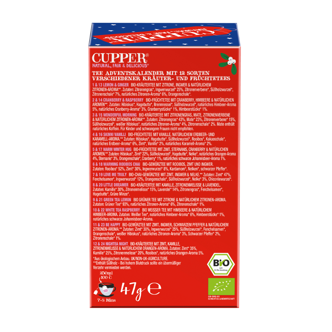 The CUPPER Tea Advent Calendar is more than just a collection of teas; it’s an experience. Each day, open a new window to discover a carefully selected tea blend that will warm your heart and soul. Whether you’re starting your day with a refreshing herbal tea or winding down with a soothing fruit infusion, this calendar promises to make your holiday season truly special.