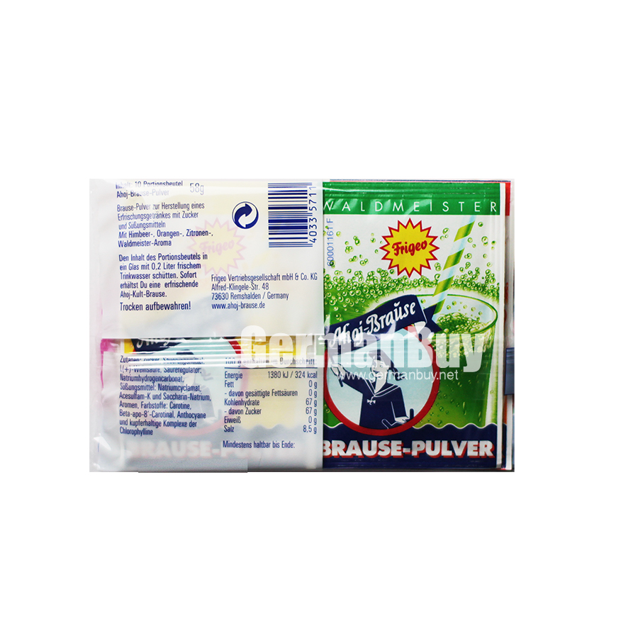 Frigeo Ahoj-Brause is a lemonade powder with different flavors of fruits – woodruff, lemon, orange, raspberry.