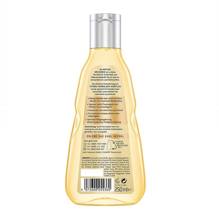 German Guhl Blond Fascination Shampoo: For naturally blond, colored, highlighted hair. Transforms dull hair into fresh, radiant blonde. Immediately moisturizes. With white orchid. Gently cleanses blond hair. Provides tactile suppleness. Intensifies the natural luminosity. For a radiantly beautiful blonde full of vitality. Content: 250 ml / 8.4 Fluid Ounces