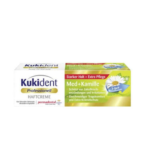 – The extra-thin tip allows easy and precise application of the smooth texture. – With elastic padding for extra comfort and sealing effect with crumb protection against food debris. – Kukident Adhesive Cream Med + Chamomile is suitable for full and partial dentures. – For a stronger bite and reliable hold all day. – Gives you more confidence and spontaneity. – Fast action – for a healthy smile!