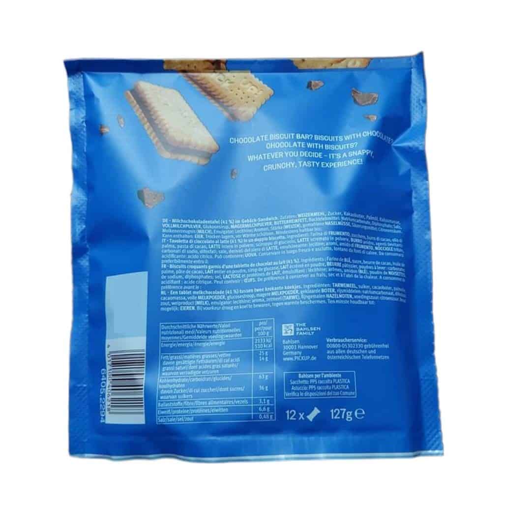 Pick up! cookies, what’s this? That are wo crunchy biscuits with a layer of crunchy milk chocolate in between – these are the popular Leibniz PiCK UP! Choco bars. As a mini version, single wrapped, the PiCK UP! Minis are particularly practical against the small appetite for biscuits and 12 pieces in a bag ensure many crispy and creamy biscuit moments.