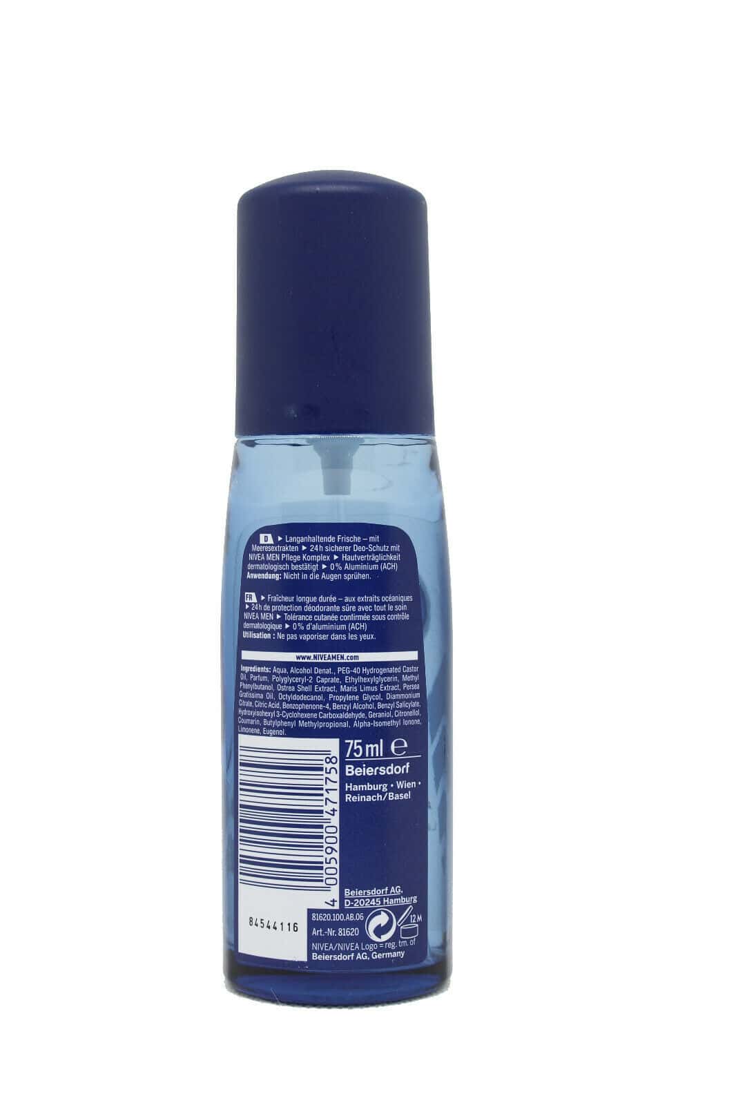 The NIVEA MEN Deodoriser Fresh Active offers effective deodorant protection without aluminum (ACH) for men who expect long-lasting, natural freshness. The highly effective formula with valuable marine extracts cools and protects against unpleasant body odor – for 24 hours.