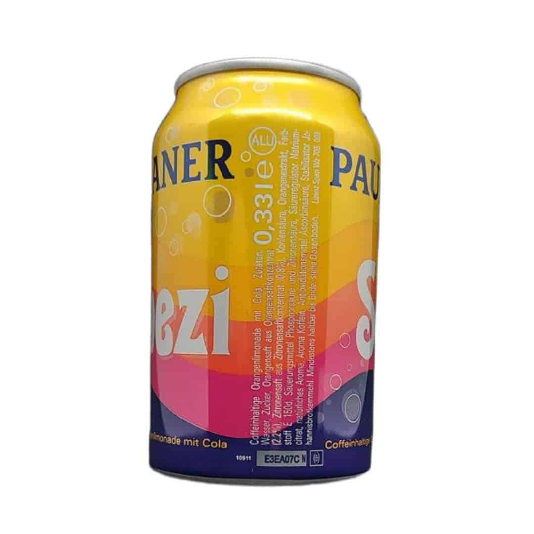 Enjoy these Paulaner Spezi Soda Can bottle. Bavarian Paulaner Spezi is a popular German soft drink made from cola and orange soda. Manufactured by Paulaner in Munich. Spezi is the Bavarian equivalent of mate, an apt term for mixing cola and orange juice.