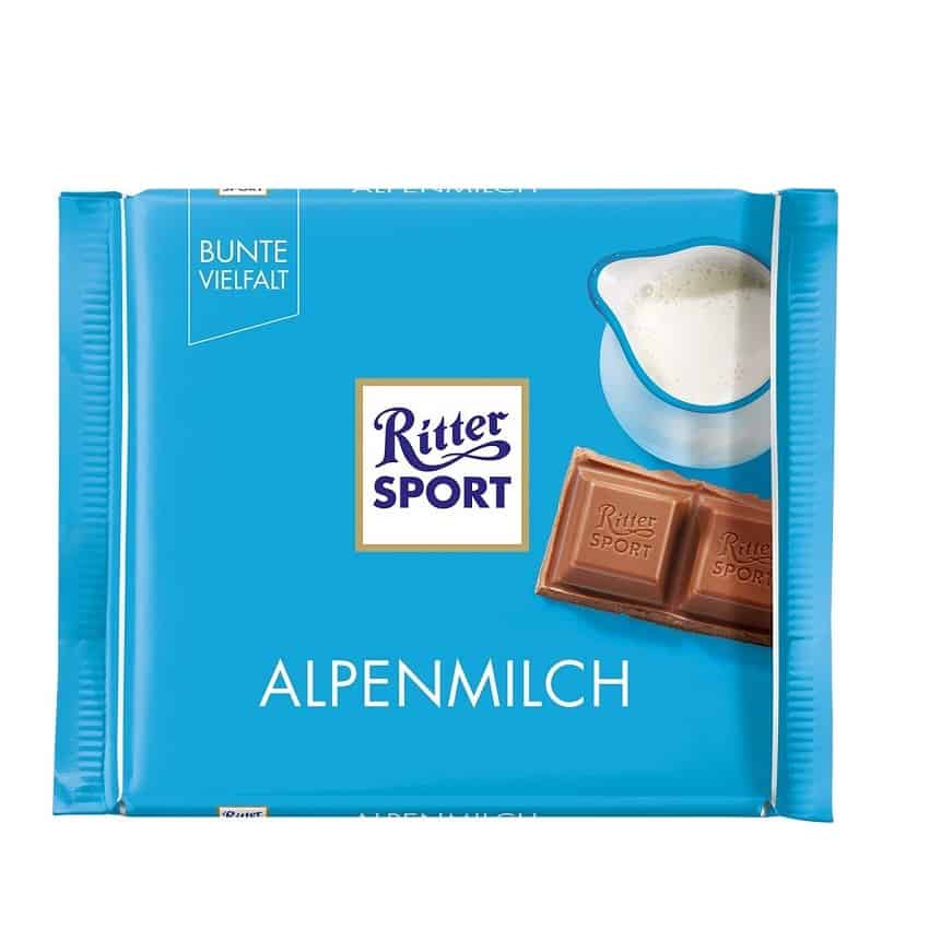 Milka Alpine Milk is the delicious, smooth melting chocolate delight from 100% authentic alpine milk – a classic for all Ritter Sport chocolate fans. Alpine milk chocolate. Milk chocolate: cocoa solids 30 % minimum, milk solids 18 % minimum.