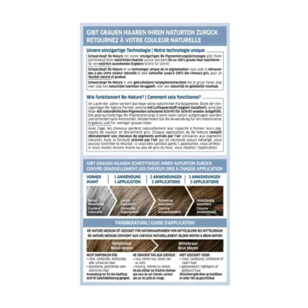 If you have reached your desired hair tone after the first application, there is no need to reapply Schwarzkopf Re-Nature. Reapply Re-Nature only if gray hairs grow back.