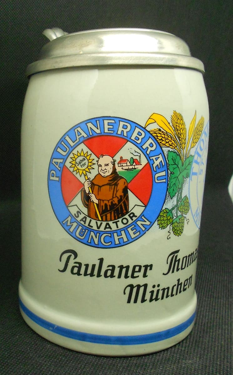 More beautiful, more decorative octoberfest stoneware jug with pewter lid – imprint on the front: “Paulanerbräu Salvator München”, “Thomasbräu St. Thomas München” (Munich, Bavaria, Germany) as well as the trademark and illustration of hops and grain, with calibration mark 0.5 l. The stein is from the Paulaner Thomasbrau brewery in Munich, a great collector’s stein!