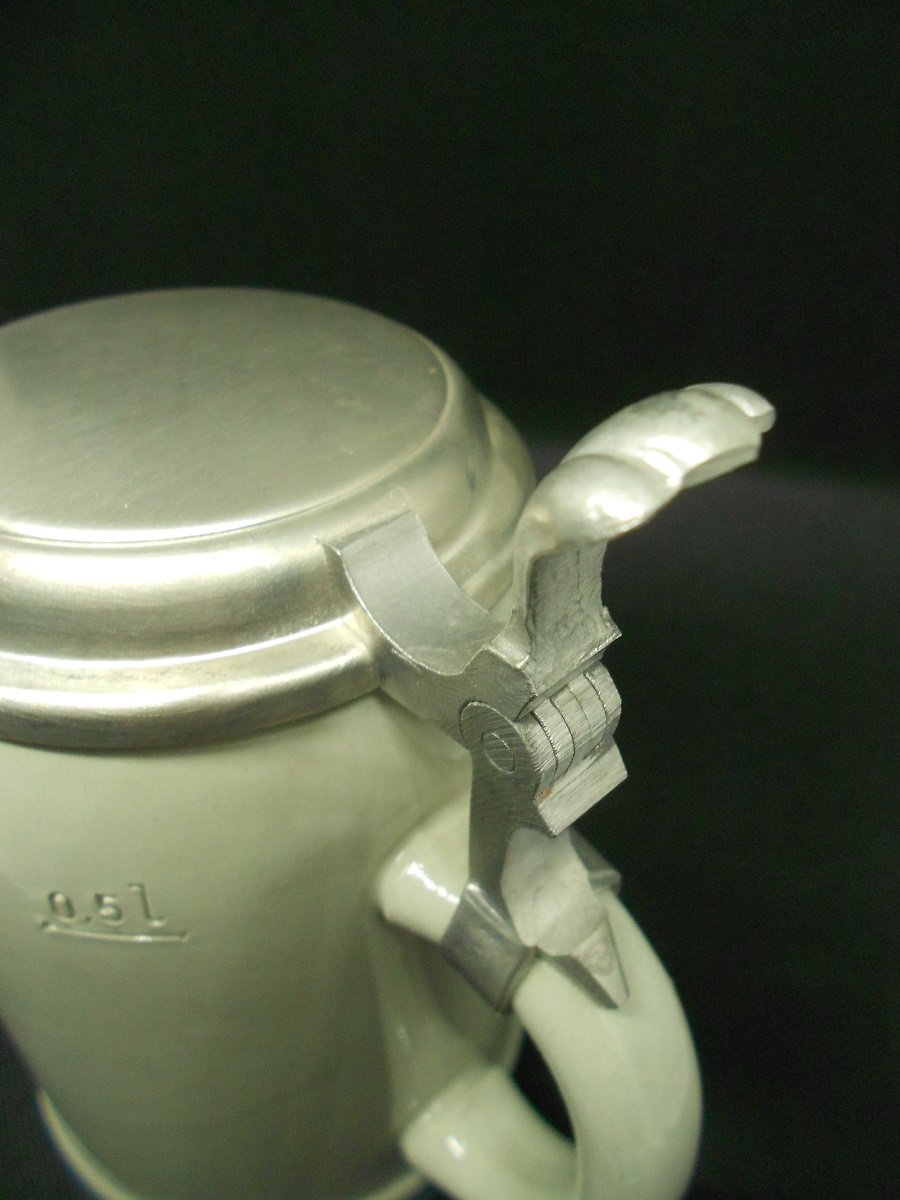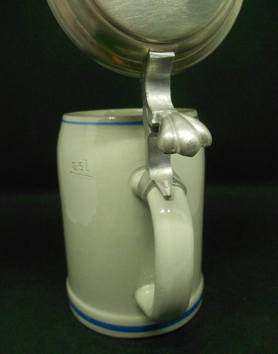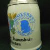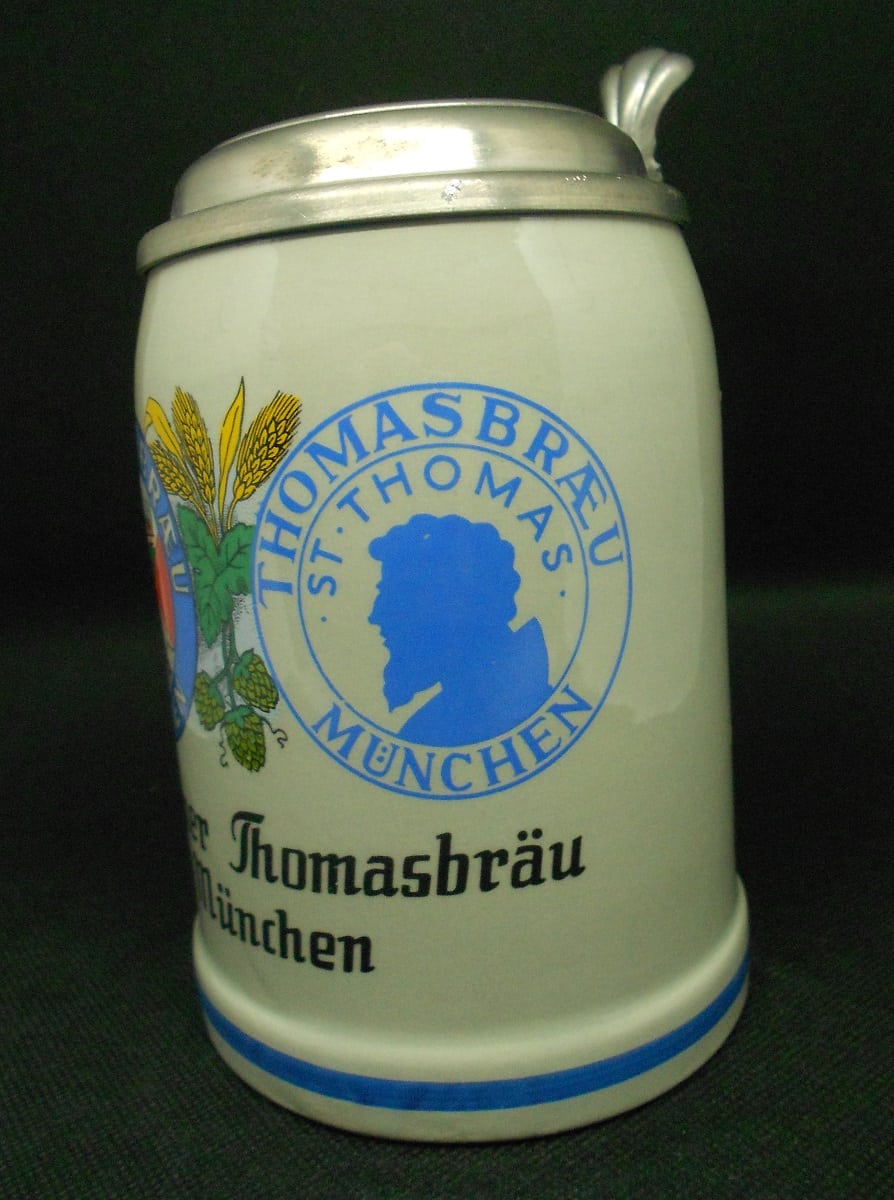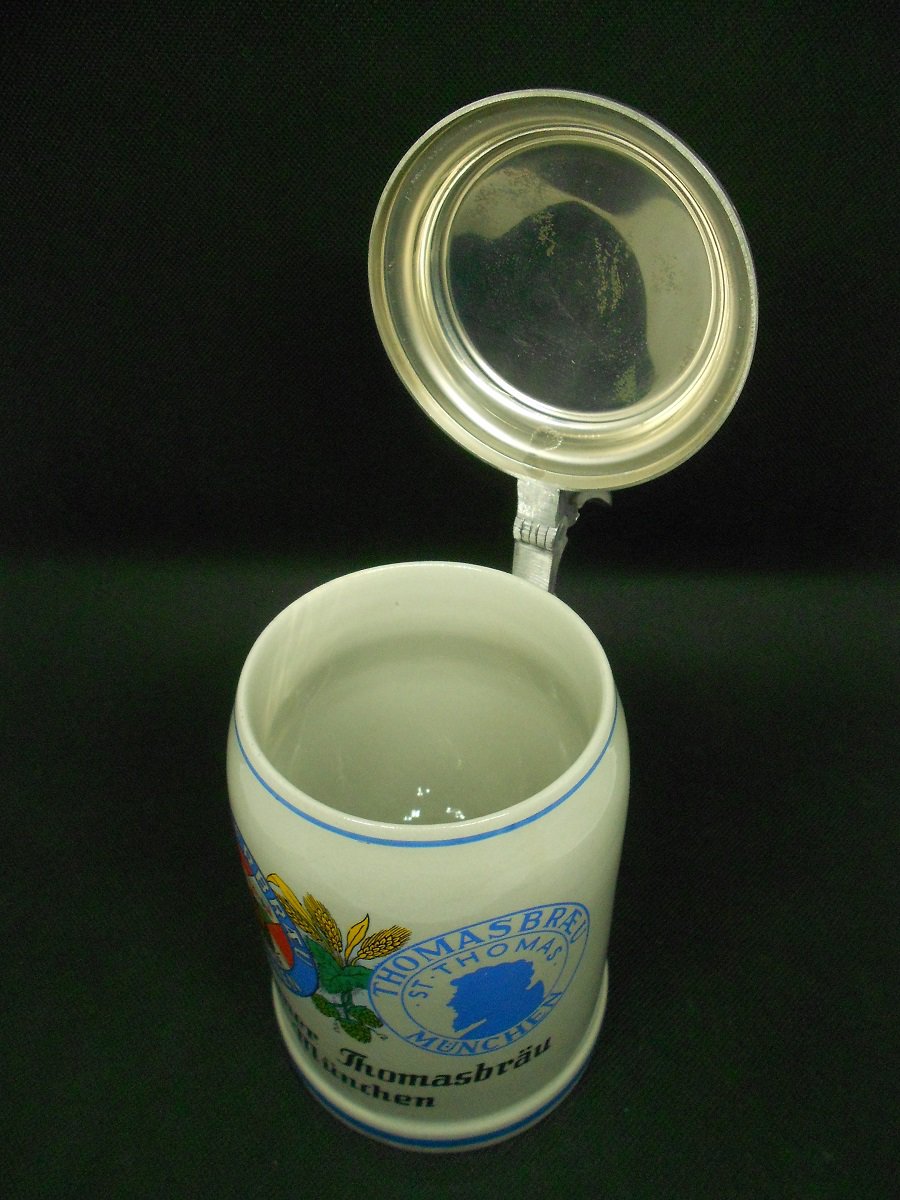 stoneware beer mug with tin lid Paulaner Thomasbräu Munich calibration mark collector